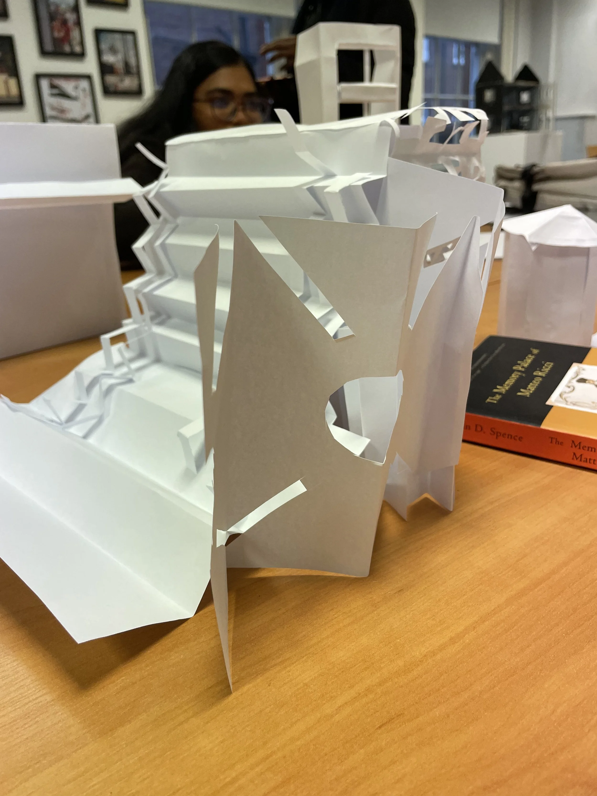 I scribble a lot and doodle, there’s a lot going on in my brain. Miro comes as a suggestion but I find myself feeling increasingly sensitive to screen time and I some how don’t want to create that way. A pen feels like it’s more attached to my body than a keyboard, so whatever gets digitised eventually, it has to start with pen, paper or the found things. I feel very disorientated this week 2, my week 1 - listening is my super power and I’m annoyed that part of the jigsaw is now missing. However, for me I create how I live and all things have meaning, so this confusion is part of the emerging picture and must be part of the design. As I apply the double diamond principle to my calling to make a cardboard sitting body - it’s suggested I get in touch with Theatr Clywyd’s prop’s department and look at artists who are paying homage to a parent. I kind of know this isn’t it - the gut speaks. I know my research is less about knowing what materials I need to make a body and more about what’s already come to me, for instance the cardboard tube that once held the blue velvet curtains. The colour and texture that might occupy this spinal column makes me think of night sky and a shimmering coolness, so is this really about my Dad or some kind of journey end? In the afternoon we make a memory palace, I want to represent the labyrinth lines somehow but only partially manage it, I enjoy the puzzle of it - trying to represent. I err towards the literal again as I make an out of scale version of the lines running down the staircase. It seems as though I waver between the literal and mystical in style. I’m fairly chuffed that I pretty quickly see how to make my staircase stay up - Dad would be amazing at this task, he used to do technical drawings and before the days of sat navs he would give me directions drawing roundabouts with a compass. There is something about embodying both Mom and Dad - both creative makers, both the ability to persevere.